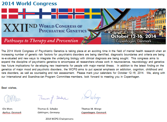 В 2014 году Всемирный конгресс генетики в психиатрии будет посвящен исследованиям генетически обусловленных факторов риска возникновения психических расстройств, возможностям генной диагностики в психиатрии и определению биологических маркеров, лежащих в основе психических расстройств.